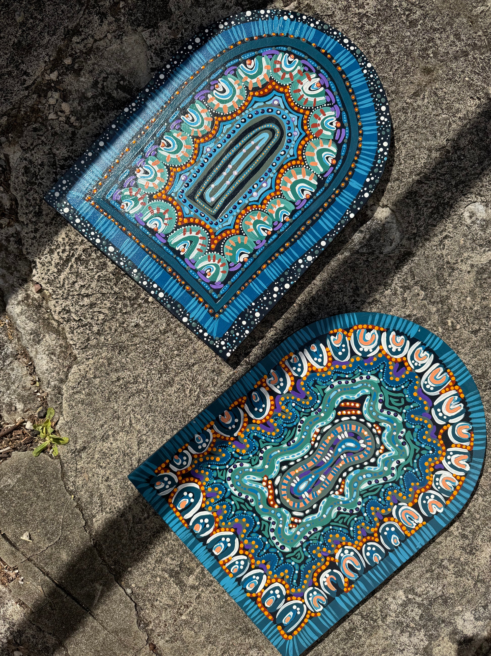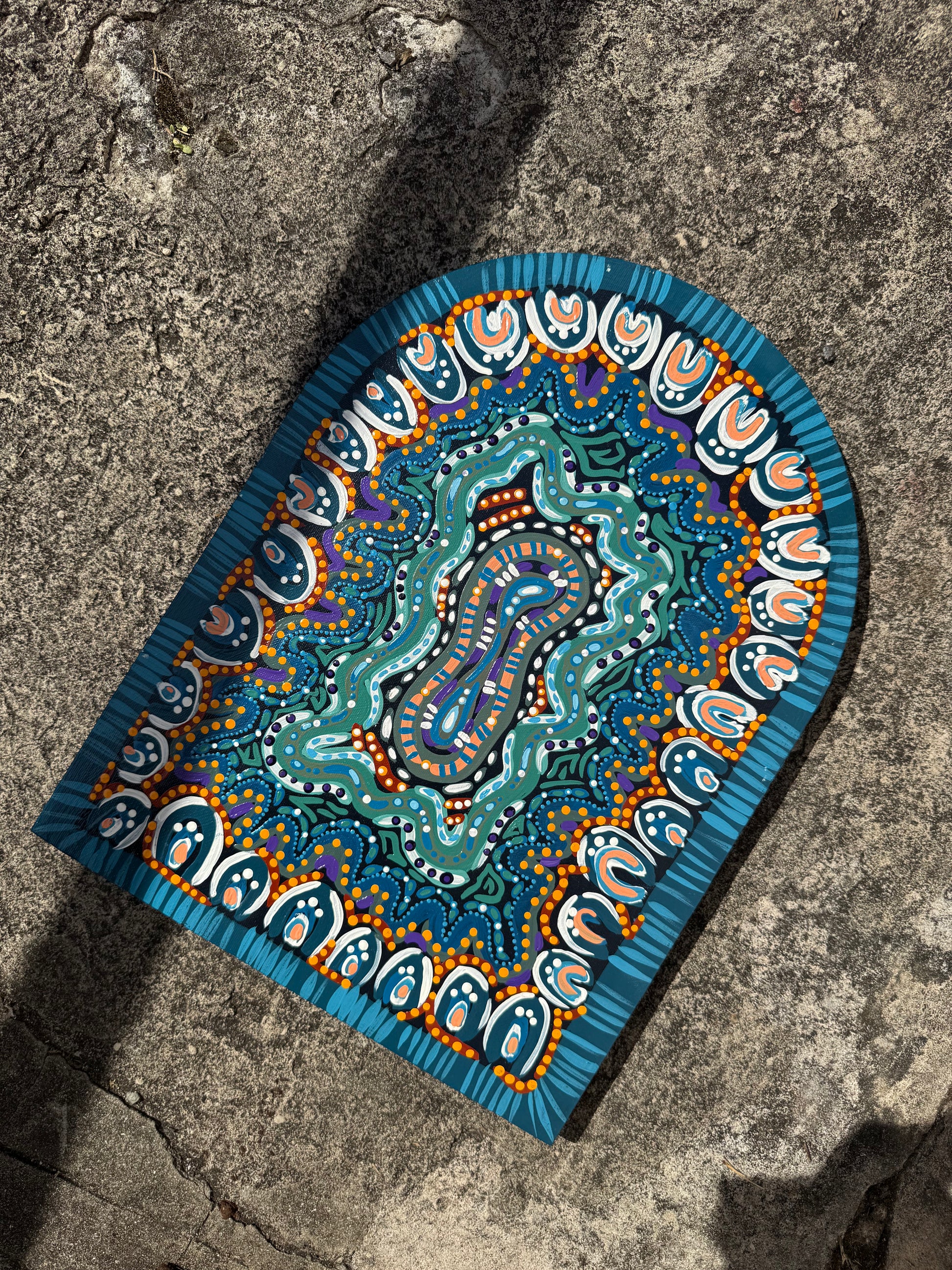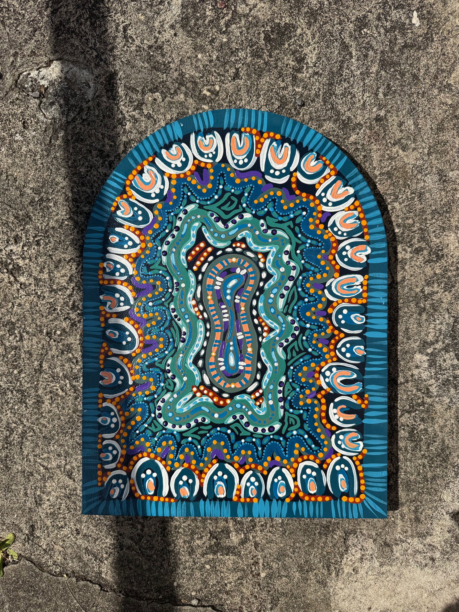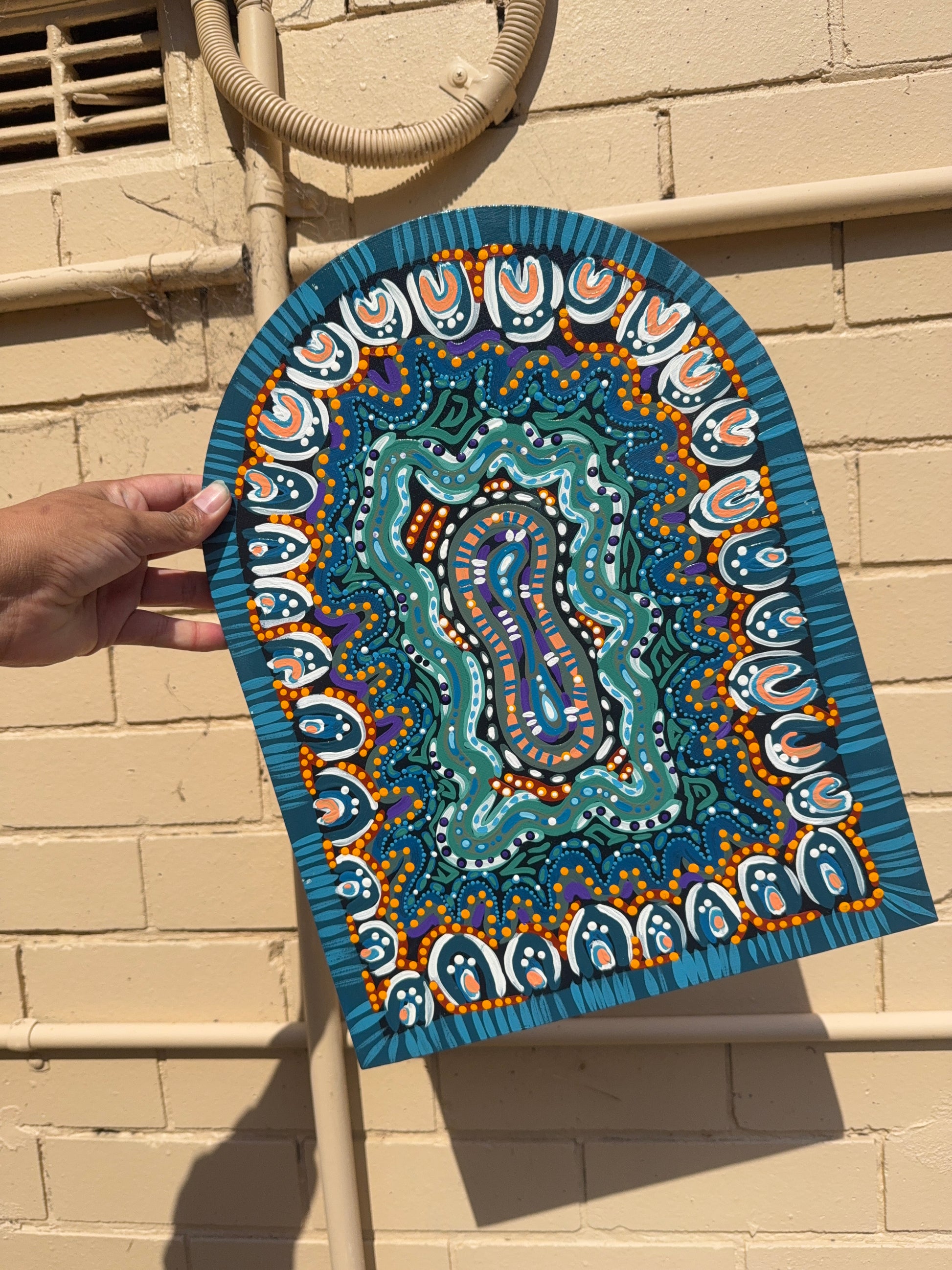 This artwork is a very distinctive style of Alicia, it is a combination of her Barkindji and Murri bloodlines. This specific design and painting is a part of a set, which is all about the celebration of healing and internal work represented by the portal captured in the centre of the work, drawing the audience in.